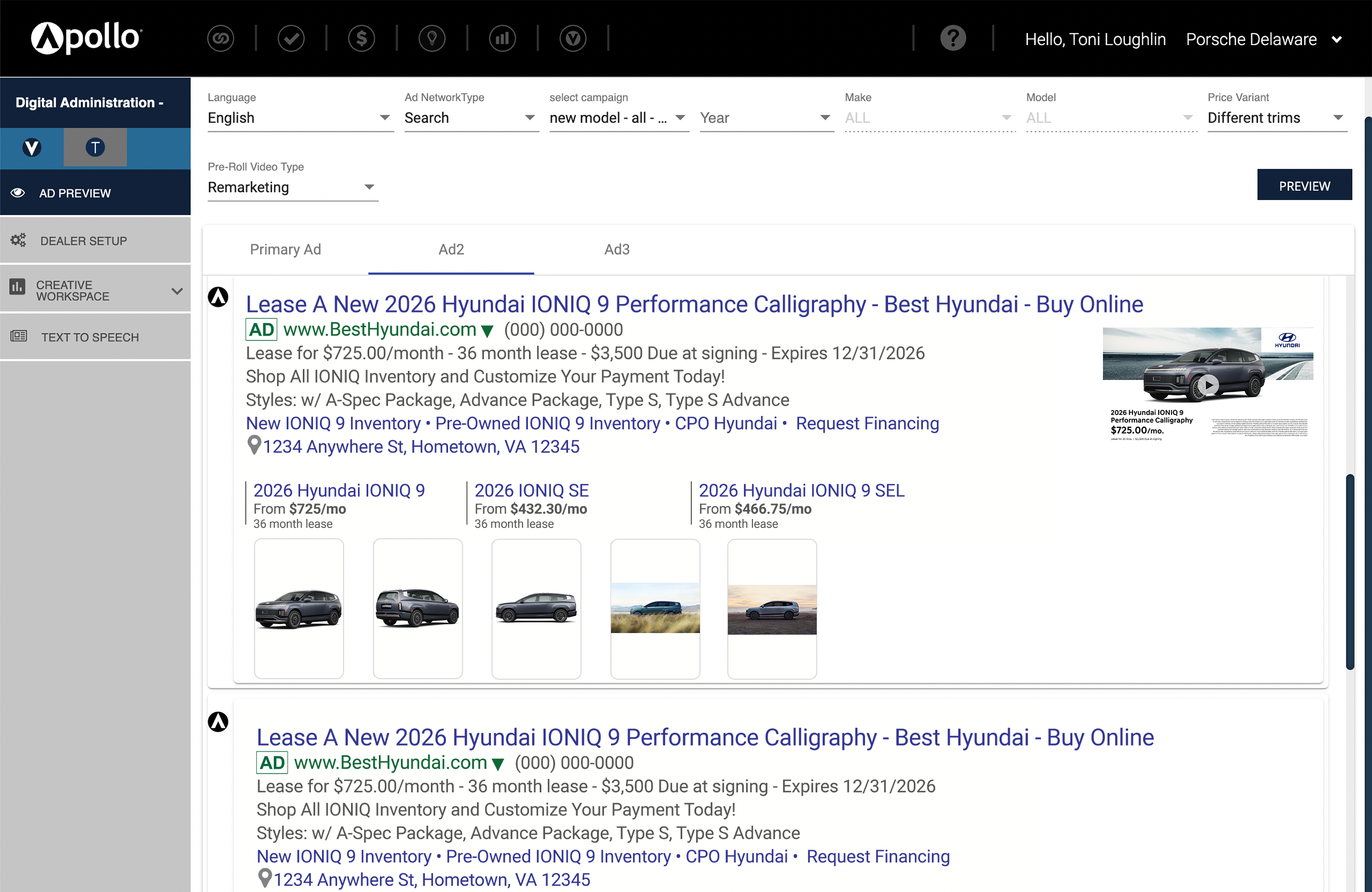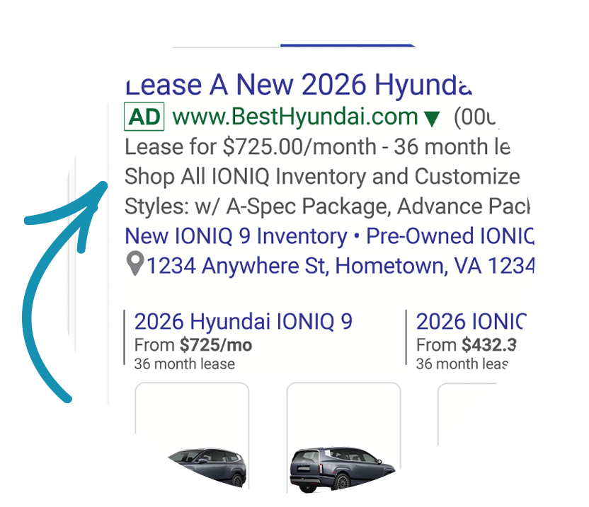 Show up at the top of search pages. Apollo Ads generates the industry’s best-performing search ads for new, used, certified, and service departments targeted to your perfect market. Our ads are strategically crafted to match consumer intent, incorporating A/B testing with up to 5 variants per ad and 3 variants per price extension to deliver maximum impact.