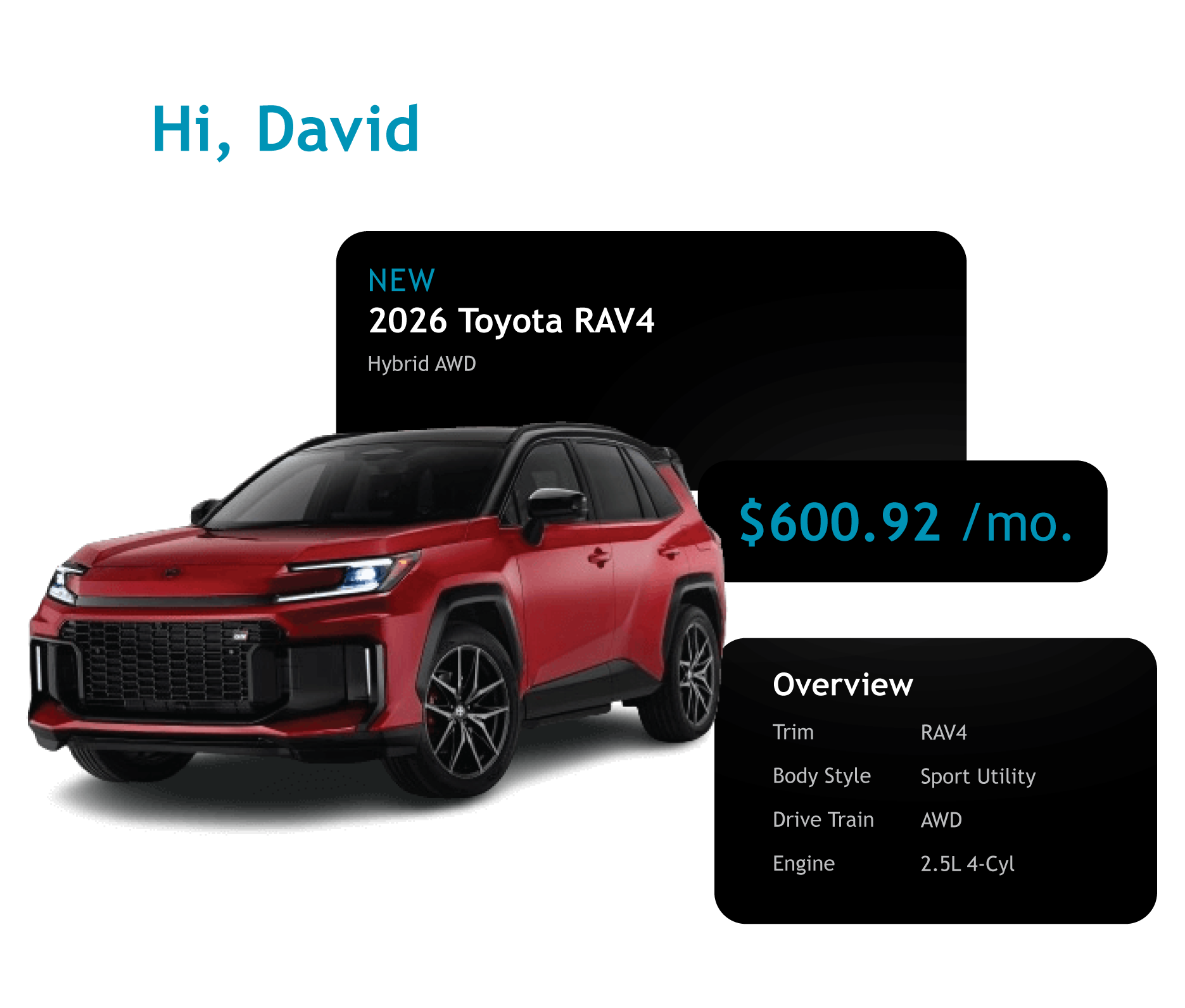 Personal vehicle details. When a customer logs in, they are greeted with their name and current vehicle details, including their current payment, pay-off, mileage, trade value, open recalls, and complete service history with your dealership.